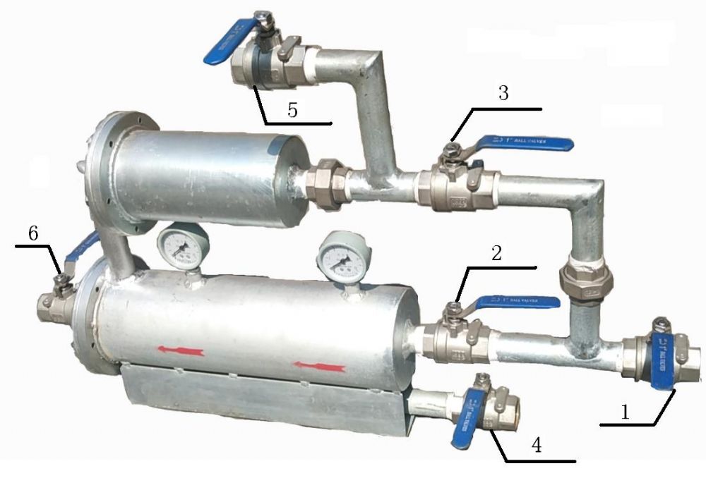 序號(hào)1、2是進(jìn)水閥門,序號(hào)3是反沖洗閥門,序號(hào)4是主過濾器排污閥門,序號(hào)5是副過濾器排污閥門,序號(hào)6是出水口閥門
